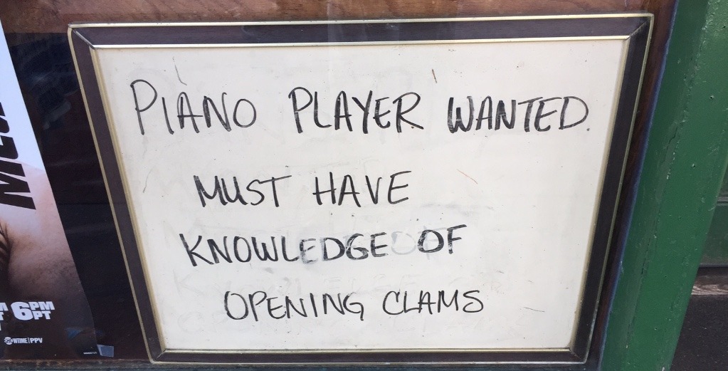 I'm sure there's a story here. There always is. But on face value, I’m trying to imagine what this new hire’s day would be like once he or she is hired. Come in early, open some clams, play some piano, and then when it gets busy, take a break from the keys and open some more clams? Think about what it takes to be able to play the piano well enough for people to pay you. You put in hours of practice as a child, then more hours as an adult. You spent time and effort working on your craft hoping to get the chance to one day be paid for all of your efforts. It’s not Carnegie Hall, but someone is willing to pay you for your talent. Piano player wanted.